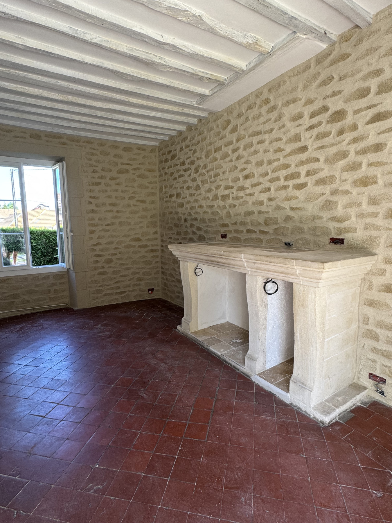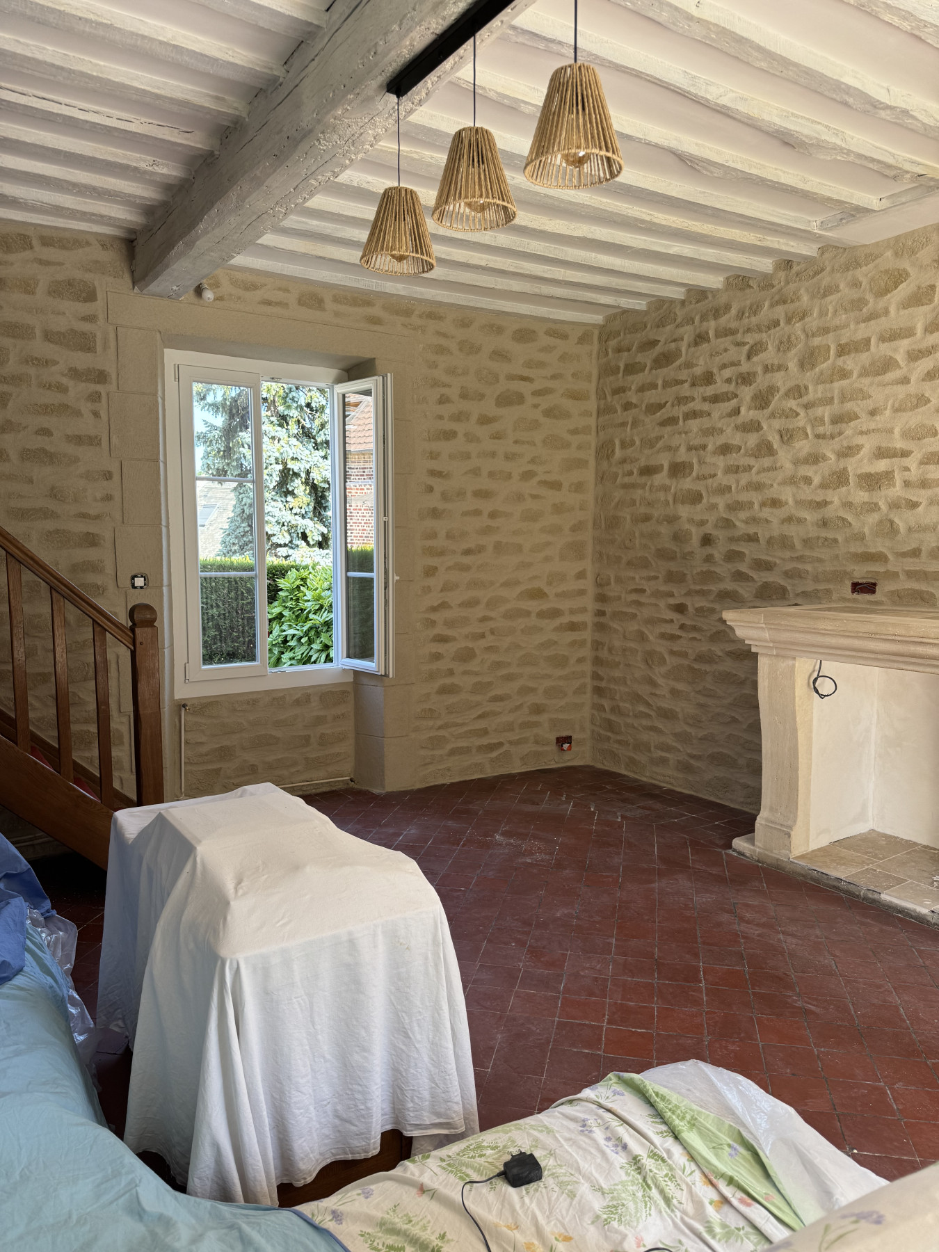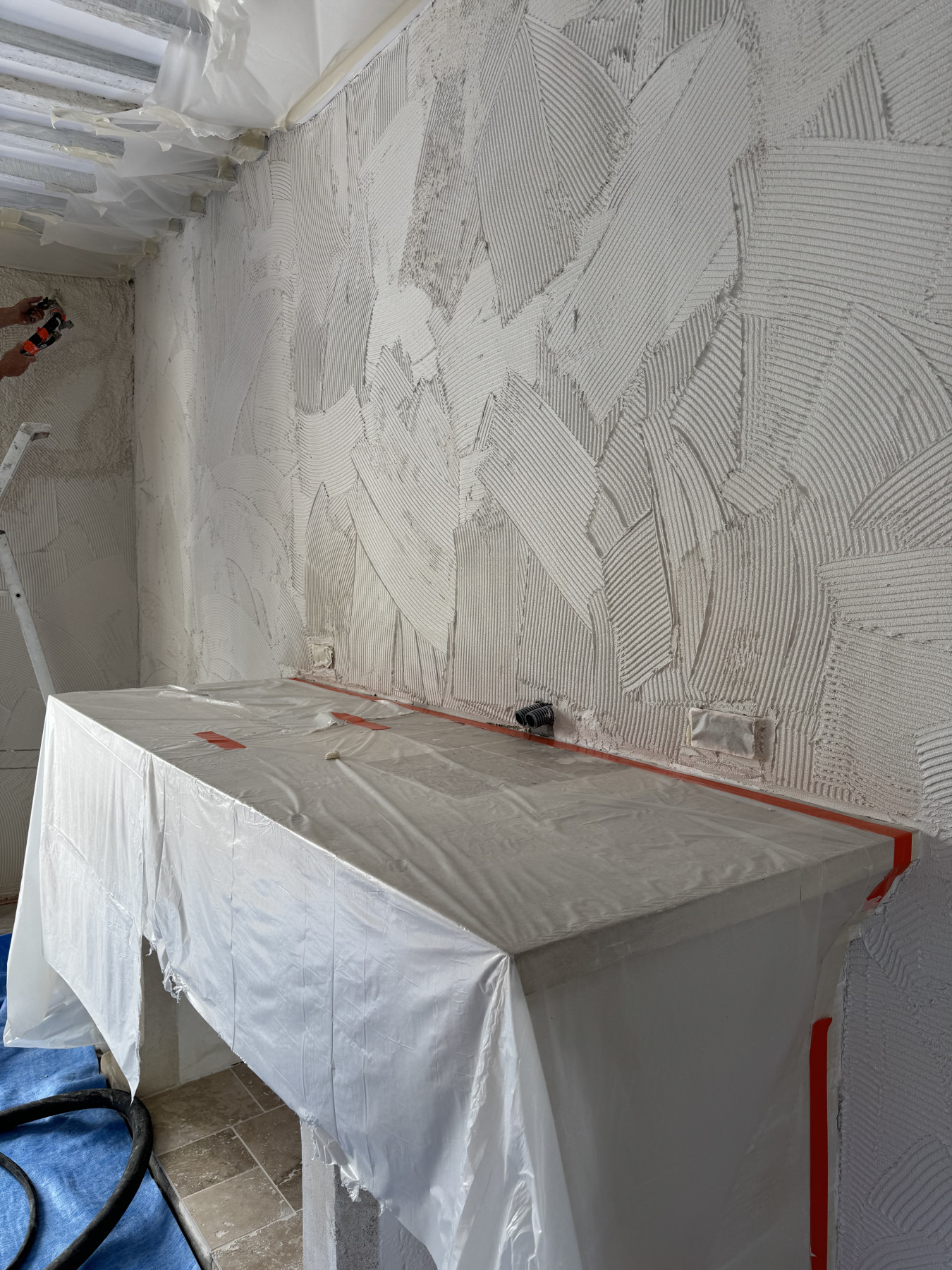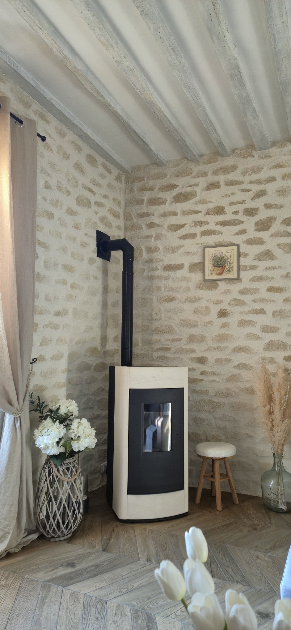 Sur ce type de chantier, le support en placo est soigneusement préparé afin de garantir une parfaite accroche de l’enduit. L’enduit décoratif aspect pierre est ensuite appliqué et sculpté à la main, permettant de reproduire fidèlement le relief, les joints et l’irrégularité naturelle de la pierre. Chaque mur devient ainsi unique, avec un rendu authentique et chaleureux.