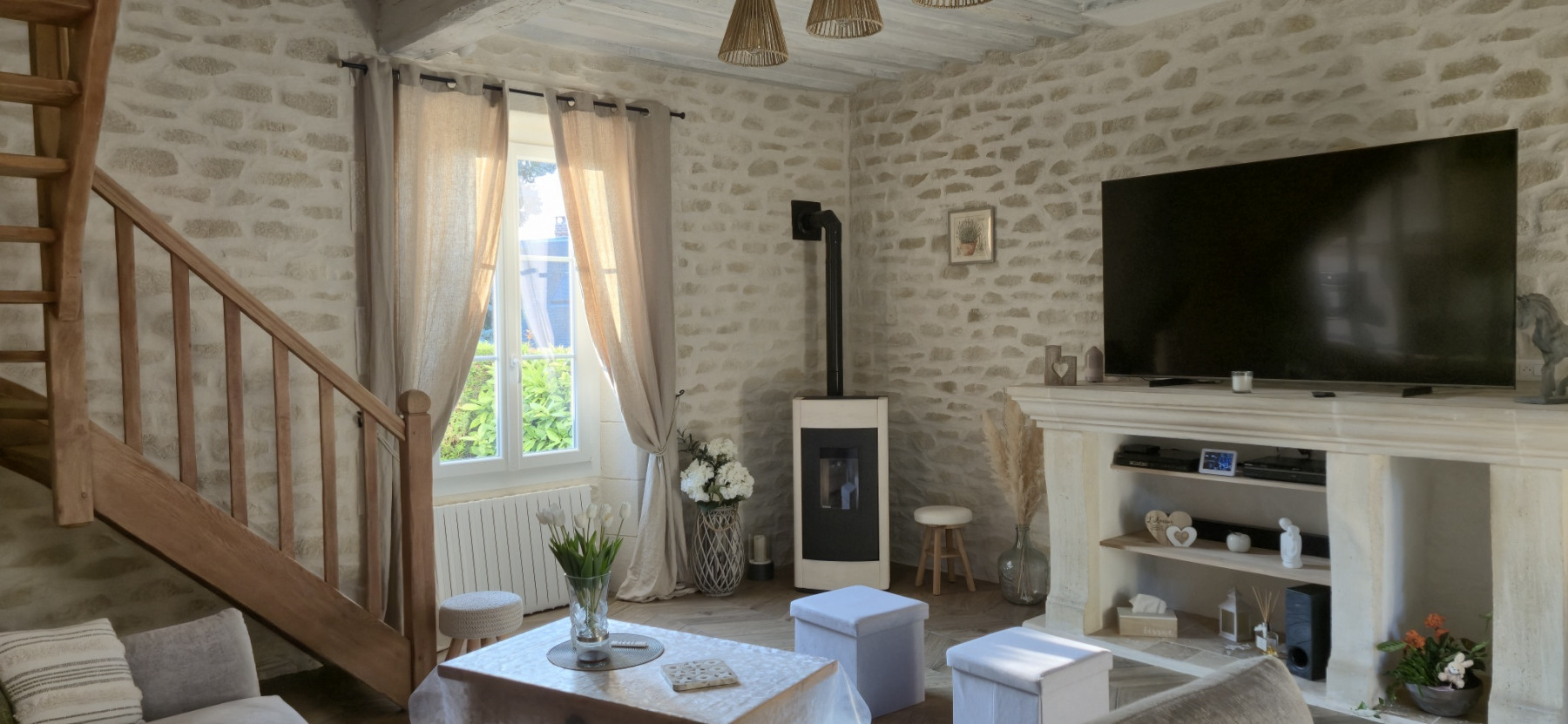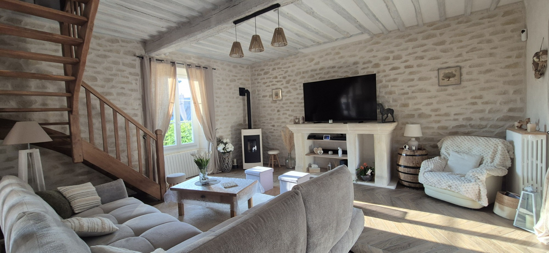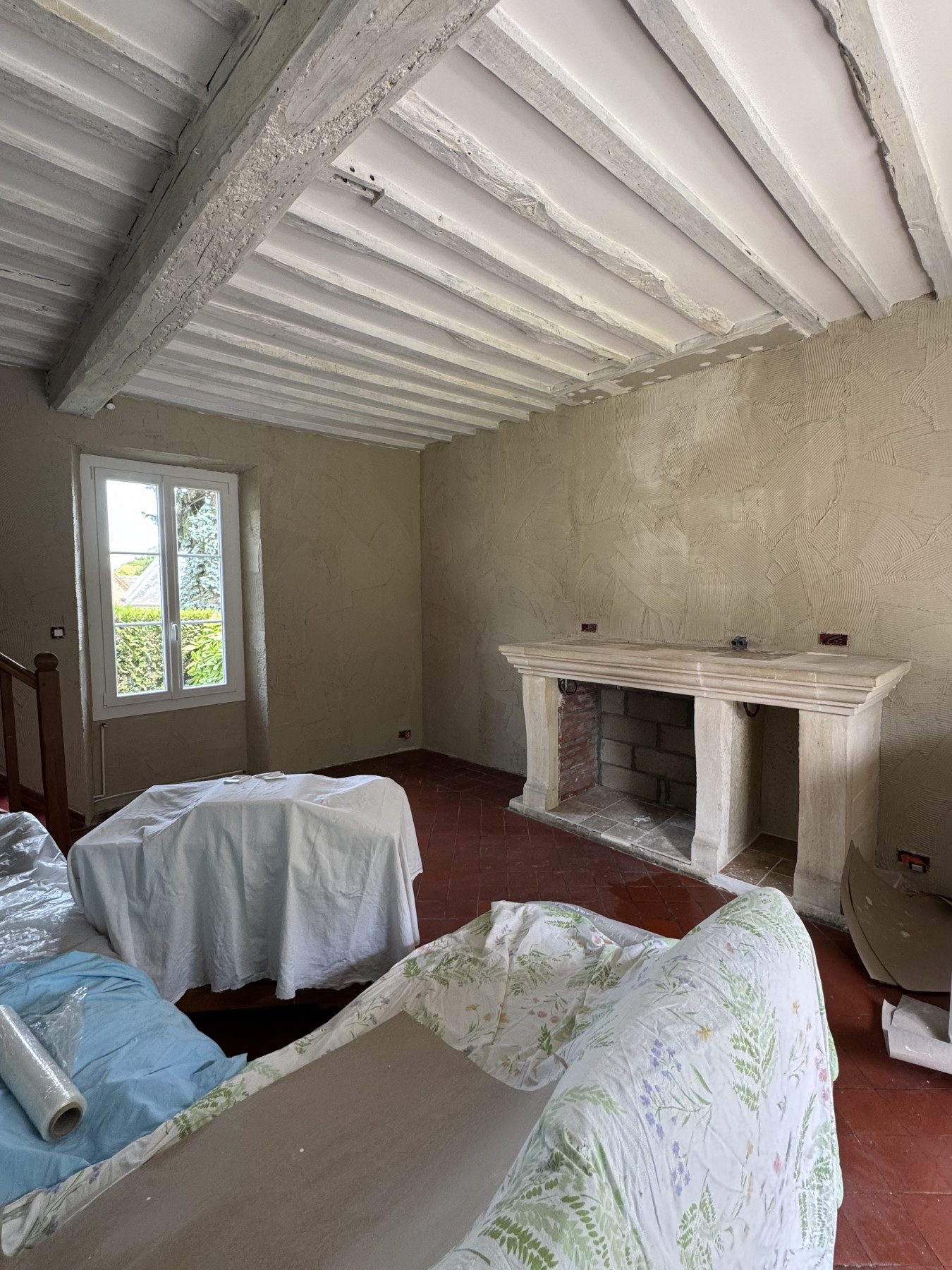 Sur ce type de chantier, le support en placo est soigneusement préparé afin de garantir une parfaite accroche de l’enduit. L’enduit décoratif aspect pierre est ensuite appliqué et sculpté à la main, permettant de reproduire fidèlement le relief, les joints et l’irrégularité naturelle de la pierre. Chaque mur devient ainsi unique, avec un rendu authentique et chaleureux.